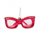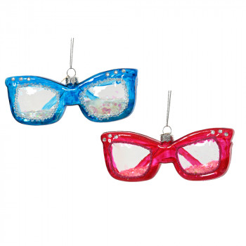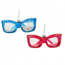 Üvegből készült, függeszthető, vidám, színes napszemüveg alakú dísz glitterrel a belsejében, 2 különböző színben: kék ás piros.