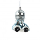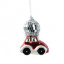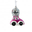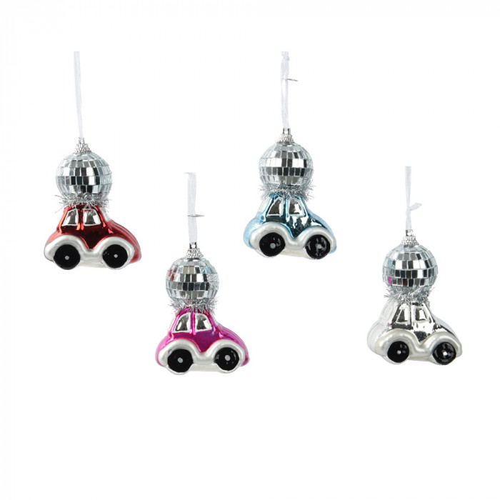 Üvegből készült, függeszthető, kisautó alakú dísz diszkógömbbel a tetején, 4 különböző színben: piros, pink, kék és ezüst.