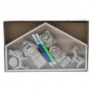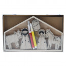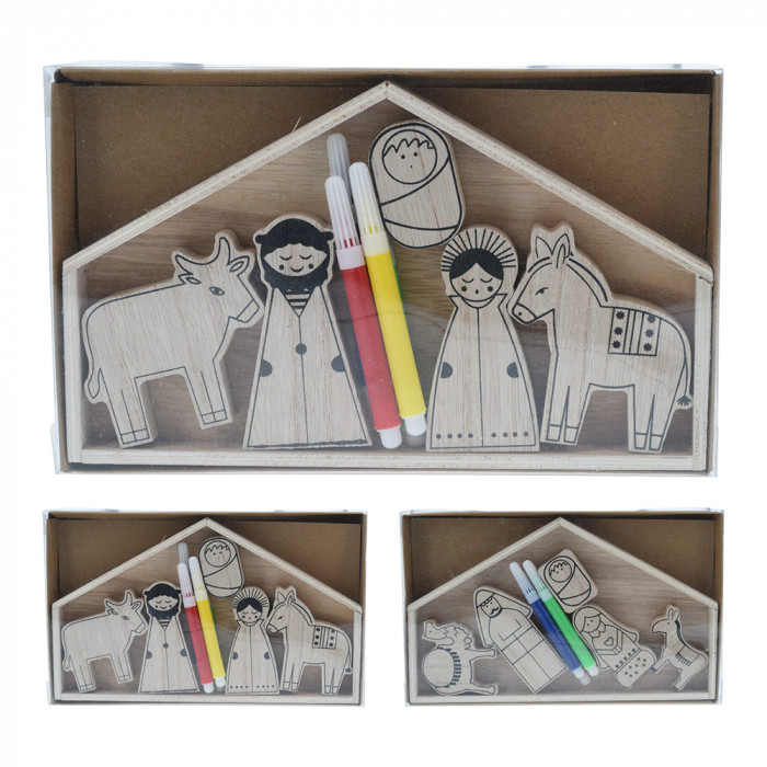 Fából készült, betlehemi jelenetet ábrázoló, színezhető dísz 9 darabos szettben, 2 különböző modellben.