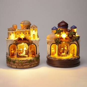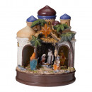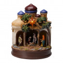 Polirezinből készült, mozgó és zenélő betlehemi életkép meleg fehér világítással, 2 különböző modellben: barna kupola és kék kupola.