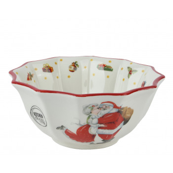 Porcelánból készült, fehér alapon Mikulást és feleségét ábrázoló tál, klasszikus elemekkel díszítve.