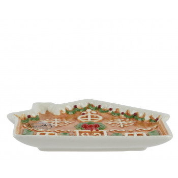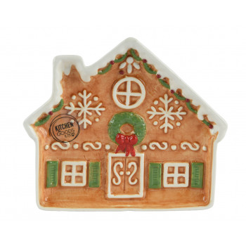Dolomitból készült, mázas felületű, domború, mézeskalács házikó alakú kínáló tál.