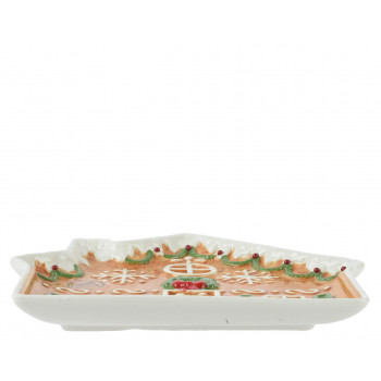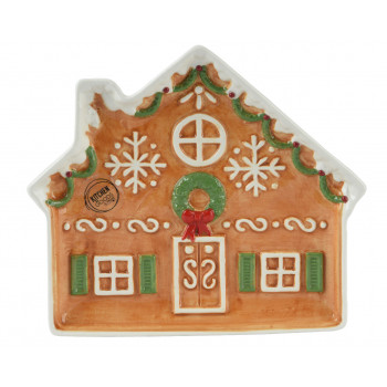 Dolomitból készült, mázas felületű, domború, mézeskalács házikó alakú kínáló tál.