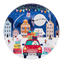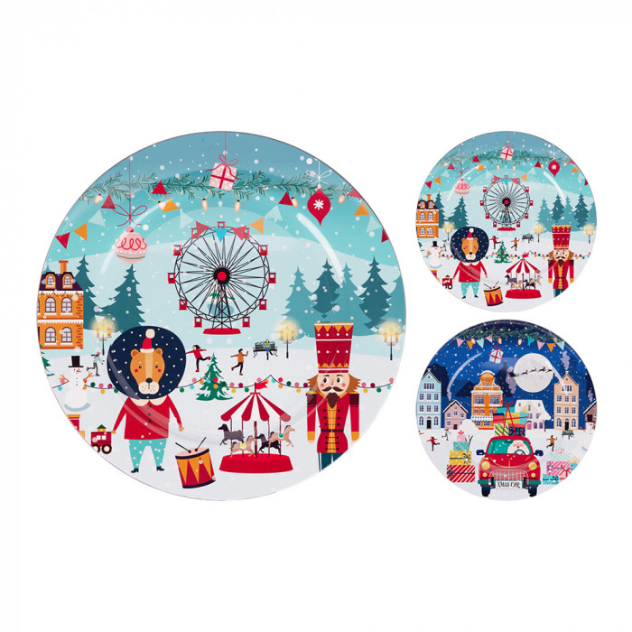 Műanyagból készült, fényes felületű, téli várost és vidámparkot ábrázoló tányér dekorációs célokra, 2 különböző modellben: vidámpark, város.