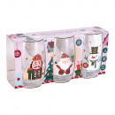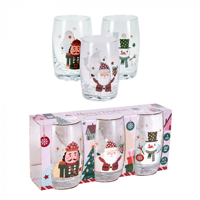 A szett tartalma: 3 különböző karácsonyi mintás pohár: diótörő, hóember és mikulás.