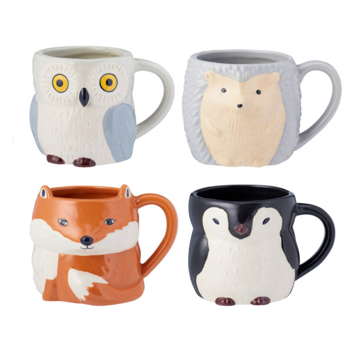 Porcelánból készült, állat formájú bögrék, 4 különböző modellben: róka, pingvin, sün és bagoly.