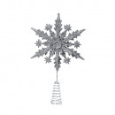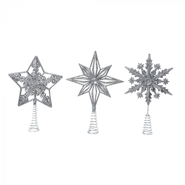Műanyagból készült, rugós aljú, fenyő csúcsra rögzíthető dísz csillogó felülettel, 3 különböző modellben.