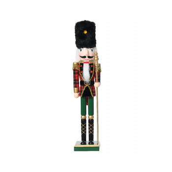 Fából készült diótörő figura kockás kabátban, szőrme sapkával, arany elemekkel díszítve dekorációs célokra.