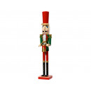 Fából készült diótörő figura klasszikus színekben, dobbal a kezében, arany elemekkel díszítve dekorációs célokra.
