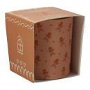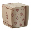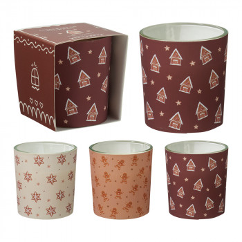 Üvegből készült, karácsonyi mintával díszített pohárban tárolt illatgyertya díszcsomagolásban, 3 különböző illatban: vanília, fahéj és mézeskalács.
