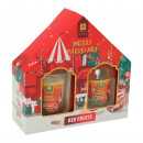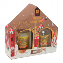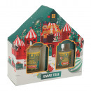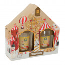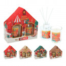 Ajándékdobozba csomagolt illatosító ajándékcsomag amely tartalmaz egy mintás üvegben tárolt illatosító folyadékot, 4 darab fa pálcikát és egy illatgyertyát 4 különböző illatban: fahéj, fenyő, piros gyümölcs és karácsonyfa.