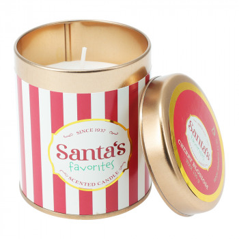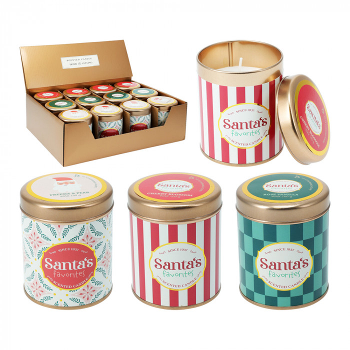Fém tégelyben tárolt, fedeles illatgyertya karácsonyi mintával és 3 különböző illatban: cseresznyevirág, frézia és körte, rózsa és vanília.