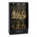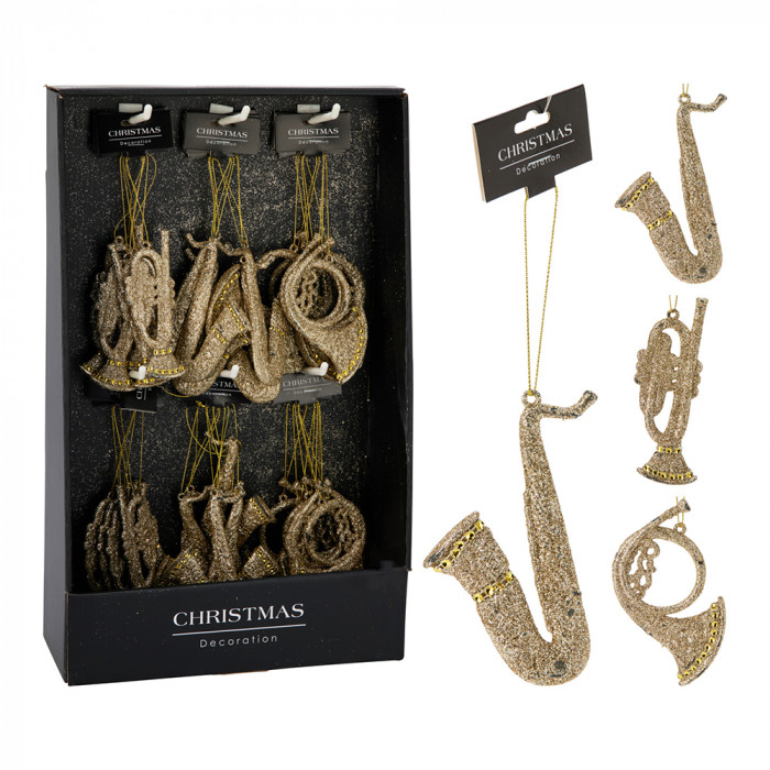 Műanyagból készült, függeszthető, csillogó felületű, fúvós hangszer alakú dísz 3 különböző modellben: szaxofon, trombita és kürt.