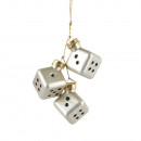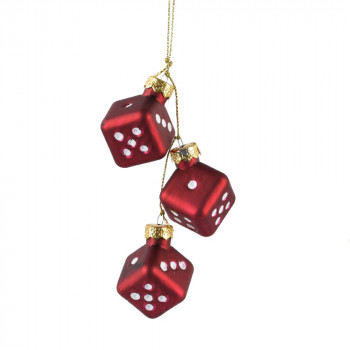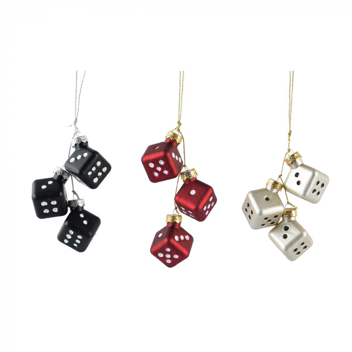 Üvegből készült, függeszthető, dobókocka alakú dísz 3 darabos csokorban, 3 különböző színben: fekete, piros és fehér.
