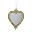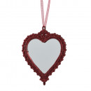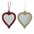 Műanyagból készült, függeszthető, csillogó elemekkel díszített, szív alakú dísz 2 különböző színben: piros és arany.