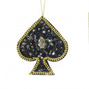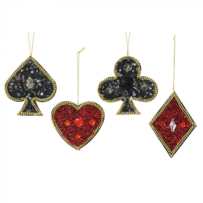 Textil alapból készült, csillogó gyöngyökkel és kristályokkal díszített, póker kártya jeleket ábrázoló dísz 4 különböző modellben.