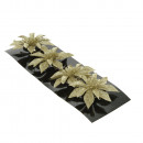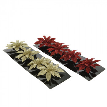 Műanyagból készült, csillogó felületű, csipeszes virág 4 darabos kiszerelésben, 2 különböző színben: arany vagy bordó.
