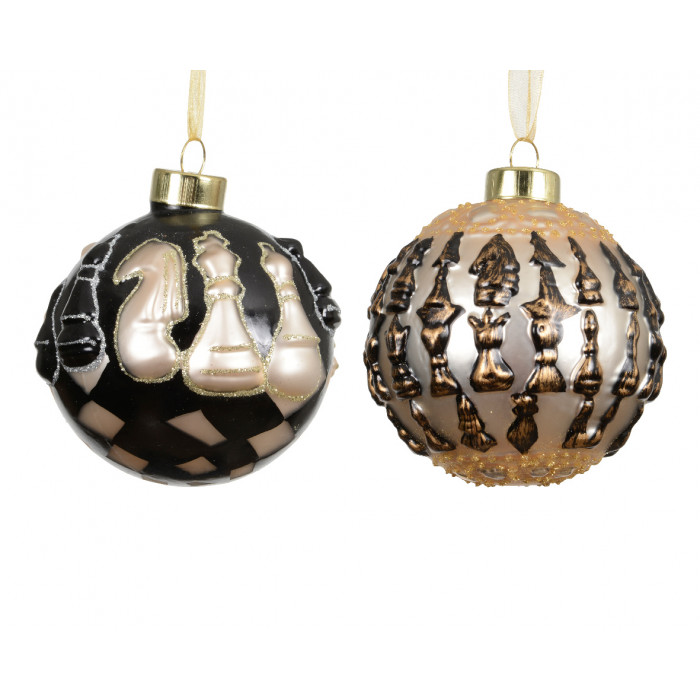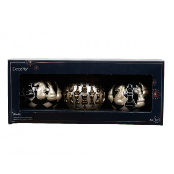Üvegből készült, függeszthető, sakk témájú mintákkal díszített gömb szett, 3 darabos kiszerelésben.