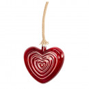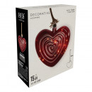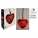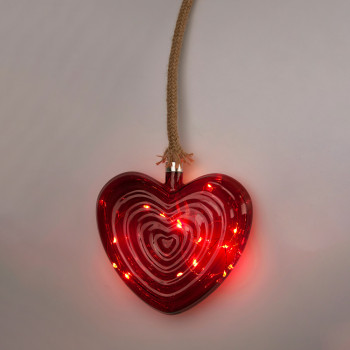 Üvegből készült, piros színű, kötélen lógó, világító szív dekorációs célokra.