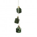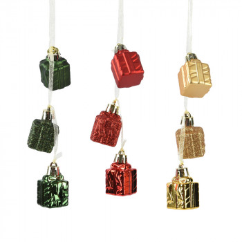 Műanyagból készült, függeszthető, 3 darabból álló, ajándékdoboz alakú lógó dísz, 3 különböző színben: piros, arany és zöld.
