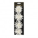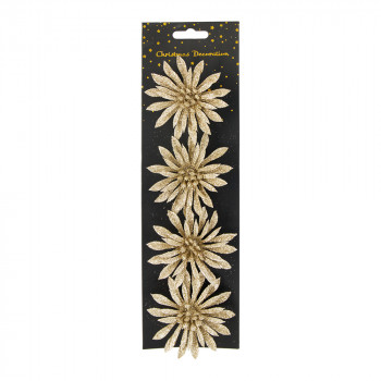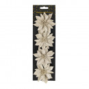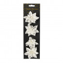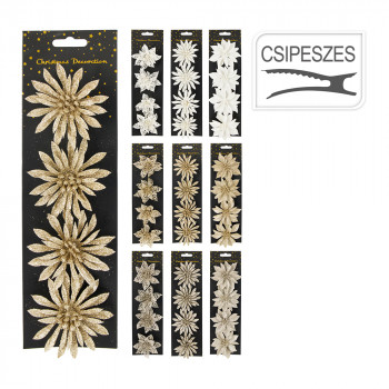 Műanyagból készült, csillogó felületű, glitteres csipeszes művirág 4 darabos kiszerelésben, 3 különböző modellben és 3 különböző színben.
