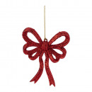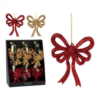 Műanyagból készült, függeszthető, kristályosan csillogó, masni alakú dísz 2 különböző színben: arany és piros.