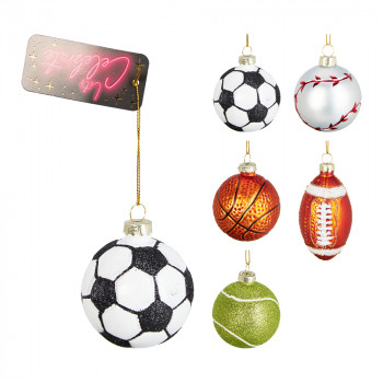 Üvegből készült, függeszthető, labda alakú dísz 5 különböző modellben: focilabda, tenisz labda, kosárlabda, baseball labda, rugby labda.
