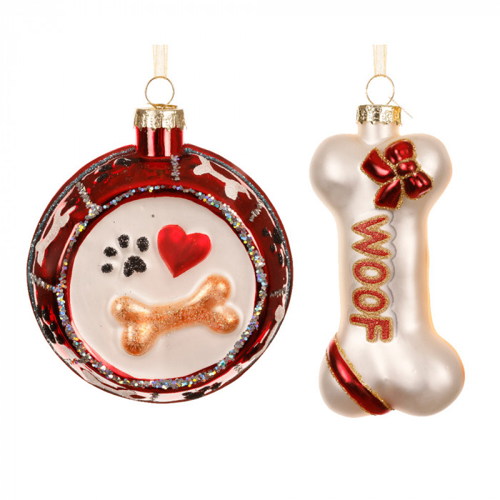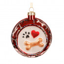 Üvegből készült, függeszthető, kis kedvencek számára ízletes falatokat ábrázoló dísz 2 különböző modellben: kutyatál és csont.