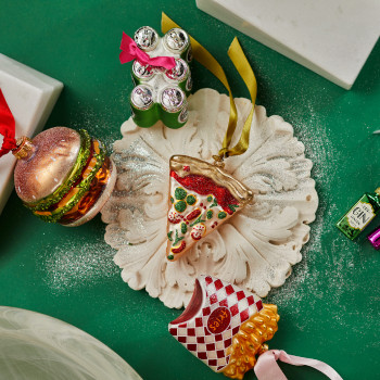 Üvegből készült, függeszthető, sör alakú üvegdísz csillogó elemekkel díszítve.