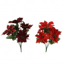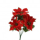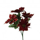 Műanyagból készült, csillogó arany szegéllyel díszített, 5 virágból álló mikulásvirág csokor, 2 különböző színben: piros és bordó.