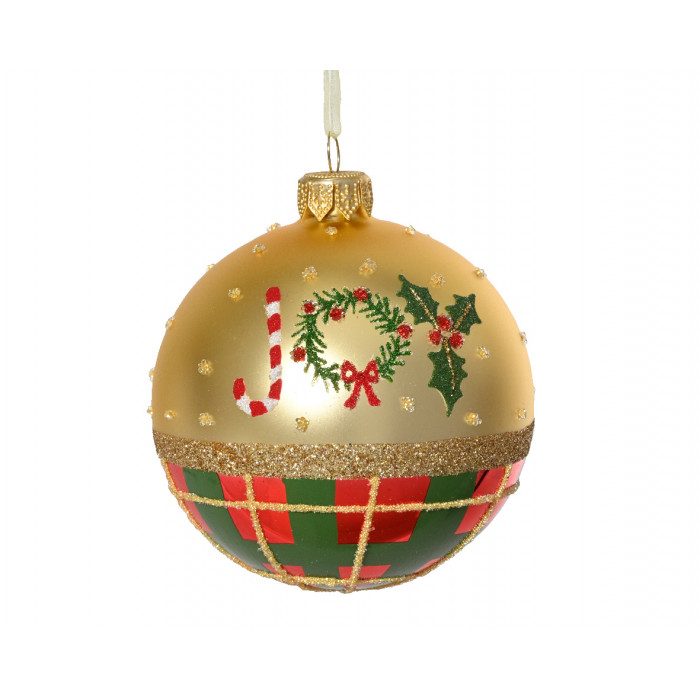 Üvegből készült, kézzel festett, arany színű üveggömb, kockás mintával és felirattal.