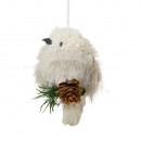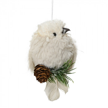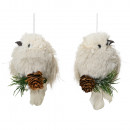 Műanyagból készült, textillel és tollakkal borított, tobozos ágon ülő madár figura 2 különböző modellben: jobbra néző és balra néző.