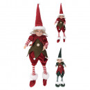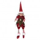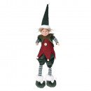 Műanyagból készült, polirezin arcú, bársonyos ruhába öltöztettet ülő manók, csíkos zokniban, 2 különböző színben: piros és zöld.