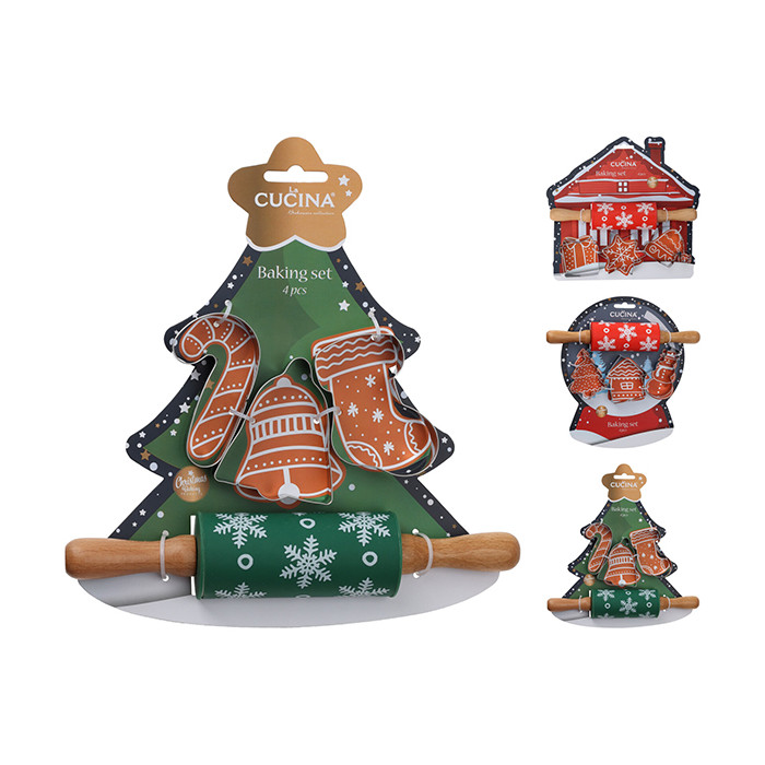 A szett tartalma: 3 db sütemény szaggató és 1 db szilikonos sodrófa.