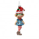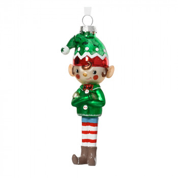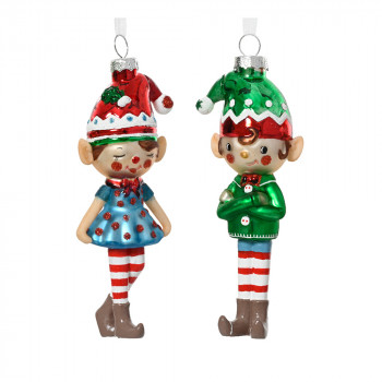 Üvegből készült, függeszthető, manócska alakú dísz csíkos harisnyával és vidám ruhával, 2 különböző modellben: kisfiú és kislány.