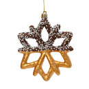 Műanyagból készült, függeszthető, csokiba mártott perecet ábrázoló dísz fehér apró szórással, 2 különböző modellben.