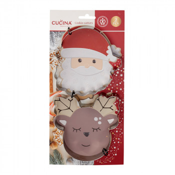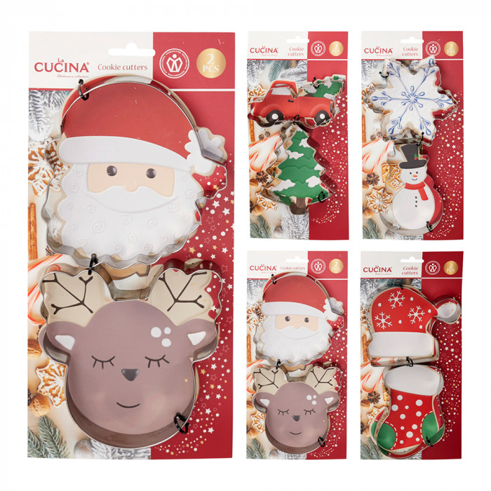 Fémből készült, forma vágott sütemény kiszúró szett 2 darabos kiszerelésben, 4 különböző modellben: Mikulás-Rénszarvas, Hóember-Hópihe, Sapka-Zokni, Autó-Fenyő.