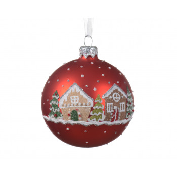 Üveg, függeszthető, mézeskalács házikó mintájú gömb piros színben.