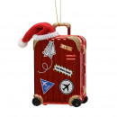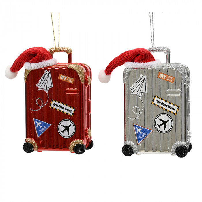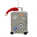 Műanyagból készült, függeszthető, mikulássapkás bőrönd dísz 2 különböző színben: piros és ezüst.