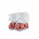 Műanyagból készült, textillel bevont kis csizma alakú, függeszthető dísz.