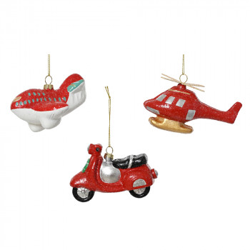 Műanyagból készült, függeszthető, járműveket ábrázoló dísz 3 különböző modellben: repülő, helikopter és robogó.