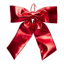 Poliészter alapanyagú, fényes felületű, piros színű, függeszthető masni dekorációs célokra.
