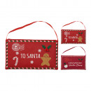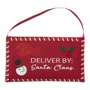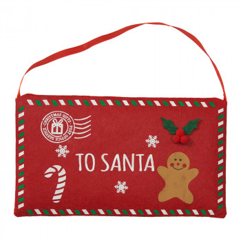 Textilből készült, boríték formájú, függeszthető dísz, piros színben, 2 különböző mintával: Delivered by: Santa Claus és To Santa.