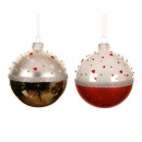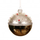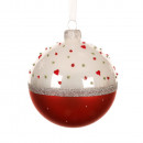 Üvegből készült, kézzel festett, apró szivecskékkel díszített gömb 2 különböző modellben: piros és ezüst.