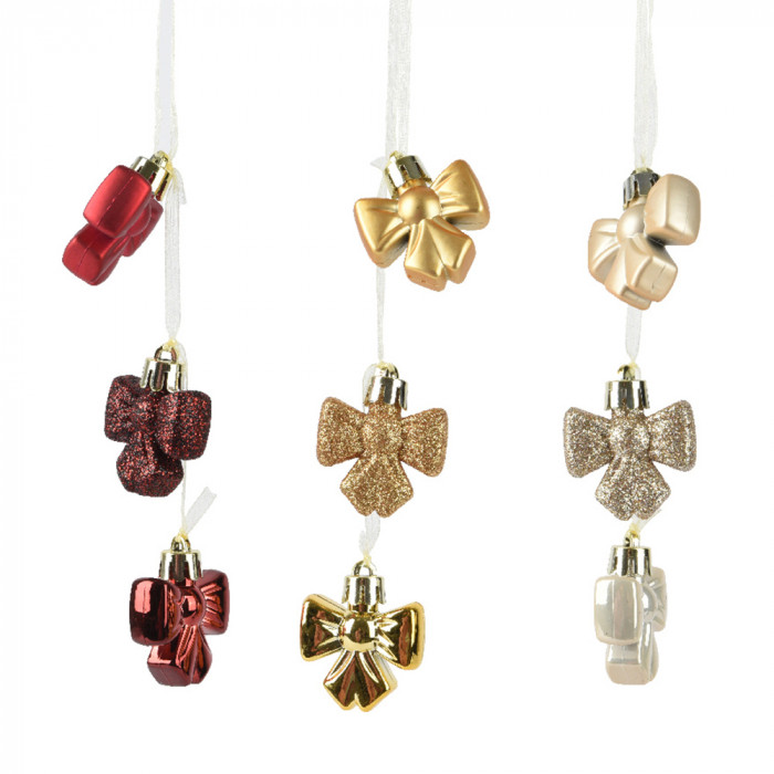 Műanyagból készült, függeszthető, 3 darabból álló, masni alakú lógó dísz, 3 különböző színben: piros, arany és pezsgő.