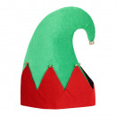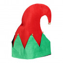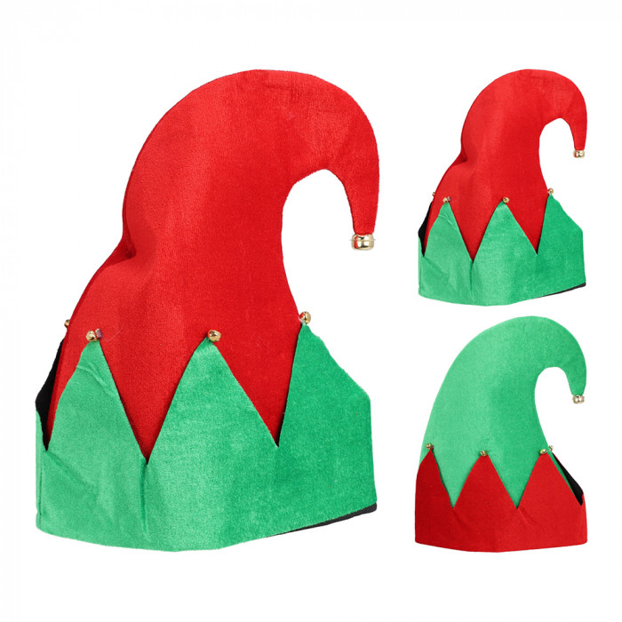 Textilből készült, vidám, fém csengőkkel díszített manó sapka, piros-zöld színekben, 2 különböző modellben: piros perem, zöld perem.