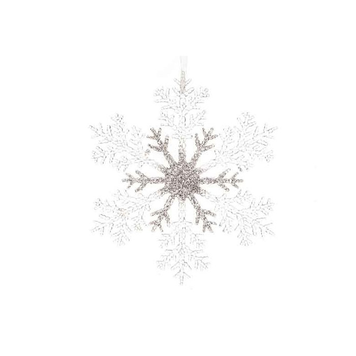Műanyag, csillogó felületű, függeszthető hópehely dísz.