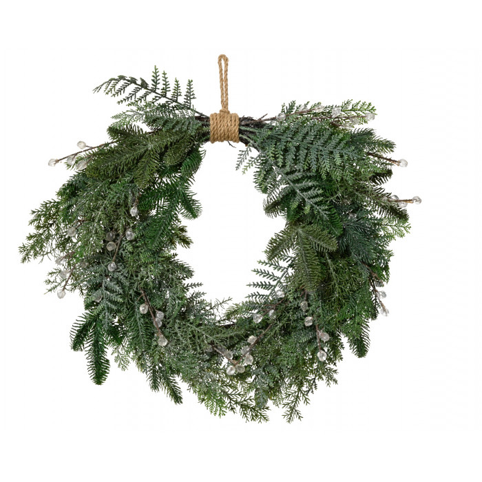Prémium műfenyő ágakból készült, jeges, fagyos hatású koszorú apró kristályokkal díszítve dekorációs célokra.