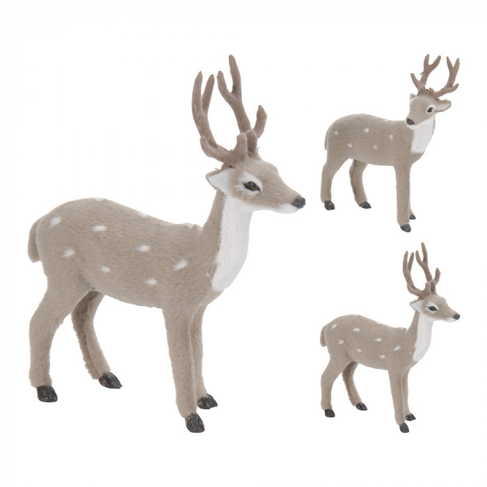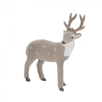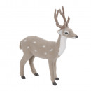 Műanyagból készült szarvas figura, puha flokkolt felülettel, szürke színben, pöttyös mintázattal 2 különböző modellben: előre néző és oldalra néző.