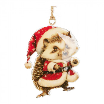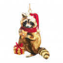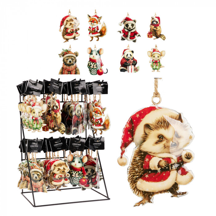 Fémből készült, függeszthető, karácsonyi sapkás állatokat ábrázoló dísz 8 különböző modellben: mosómedve, panda, borz, róka, süni, egérke,medve és hörcsög.